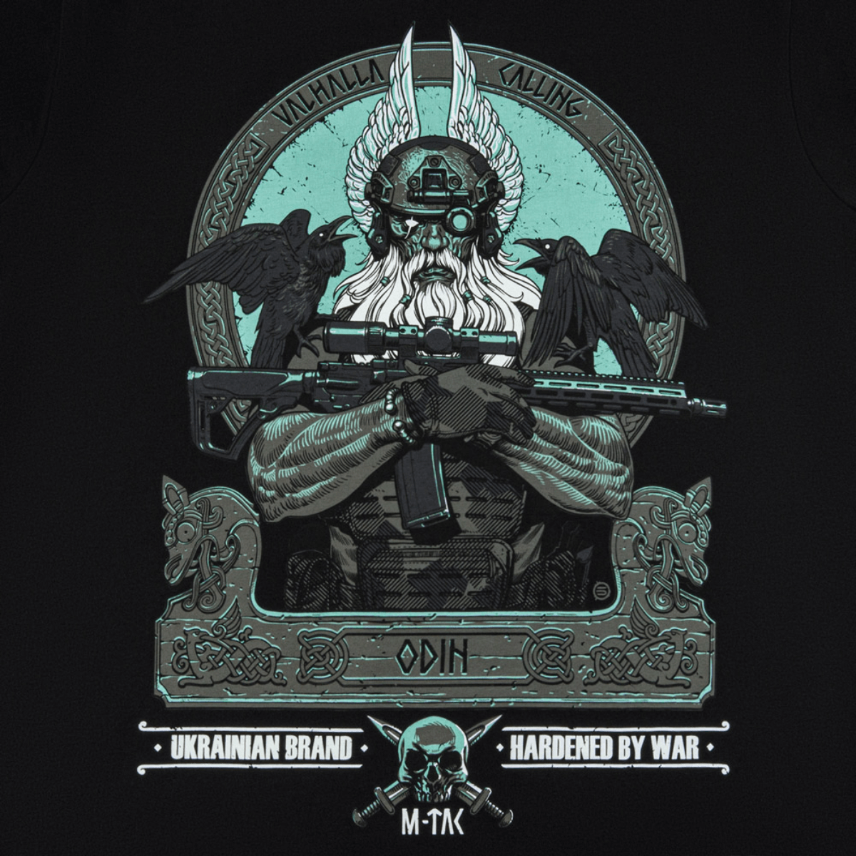 M-Tac T-shirt Odin Mystery långärmad fortsätter serien med den högste guden i nordisk mytologi. Trycket visar Odin med AR-15, iklädd modern stridsutrustning och NVD-hjälm, redo för den avgörande striden. På hans axlar sitter korparna Hugin och Munin, och texten "Valhalla Calling" syftar på vikingarnas legendariska stridsrop.